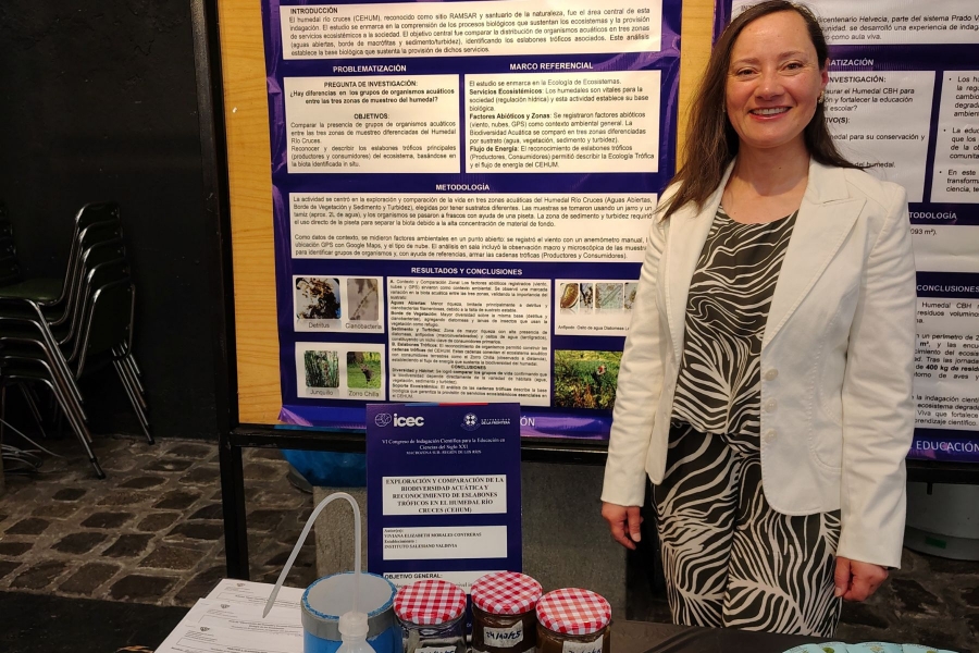 En este importante encuentro, la profesora Morales presentó la ponencia “Exploración y comparación de la Biodiversidad Acuática y reconocimiento de eslabones tróficos en el Humedal Río Cruces (CEHUM)”, una experiencia que incluyó una demostración práctica del trabajo realizado en terreno junto a los estudiantes de 3° medio del electivo Biología de los Ecosistemas.